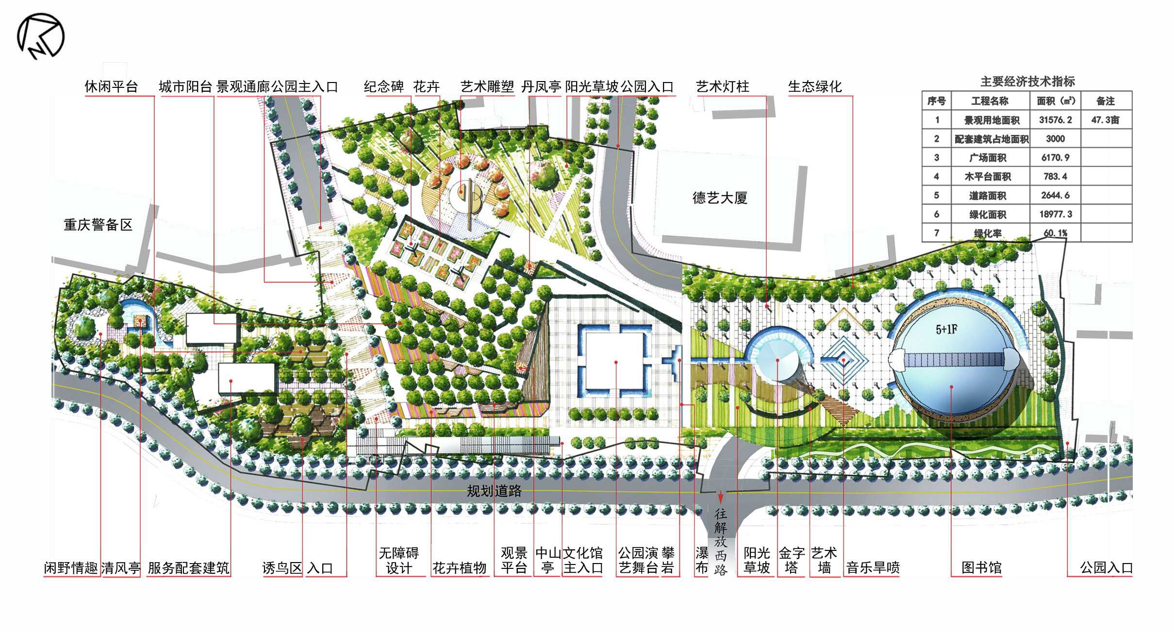 The features of Chongqing which is undulating mountain are presented in the form of polyline on the plan. We use the central axis of the landscape formed by the library, central performing stage, breeze pavilion, and viewing platforms to compose the beginning, climax and the end of a story. There are many various activity spaces beside the central axis, such as monuments, art sculpture plaza, lawn and so on.