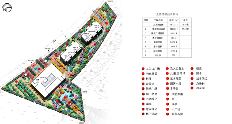景觀設計以花園式為主,亭臺樓閣、小橋流水相映成趣。在主建筑辦公樓后設計了面積300方的戲水泳池,周圍以點景樹、亭、棧道互相聯通。泳池以小溪的形式流向次入口,整個項目都在水的包圍中,搭配四季變化的植物猶如一個縮小版的“蘇州園林”。