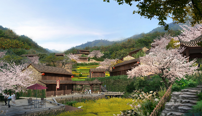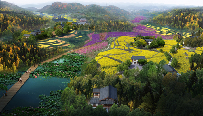 according to the characteristics of the terrain and resources , the design is inspired by the mountains, water systems, woodlands and idyllic areas, emphasiz the beauty of the natural venation, make the modern landscape art through the natural skill to reproduce the beauty of nature, artificial beauty, and pastoral beauty. It’s planning structure is one ribbon, three core, four groups.